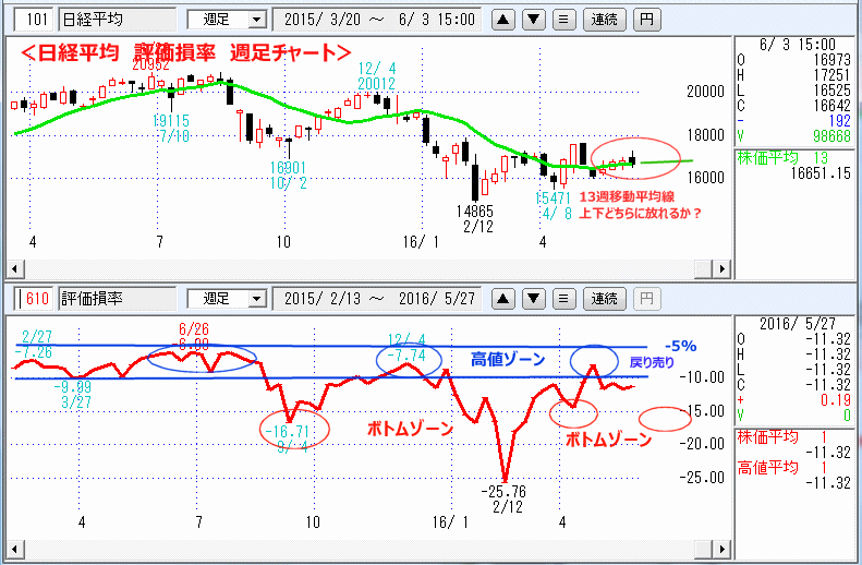 6月入りからの下落を見れば、4月から5月の「610」評価損率(5/13)-8%から-10%の水準が戻り高値であった事がわかります。(5/20)-11%→5月(27)-11%の水準を維持したが、-10%前後は高値ゾーンと言えます。今週の下落を見れば高値圏であった事がわかります。-10%から-5%の範囲は戻り売りゾーンです。