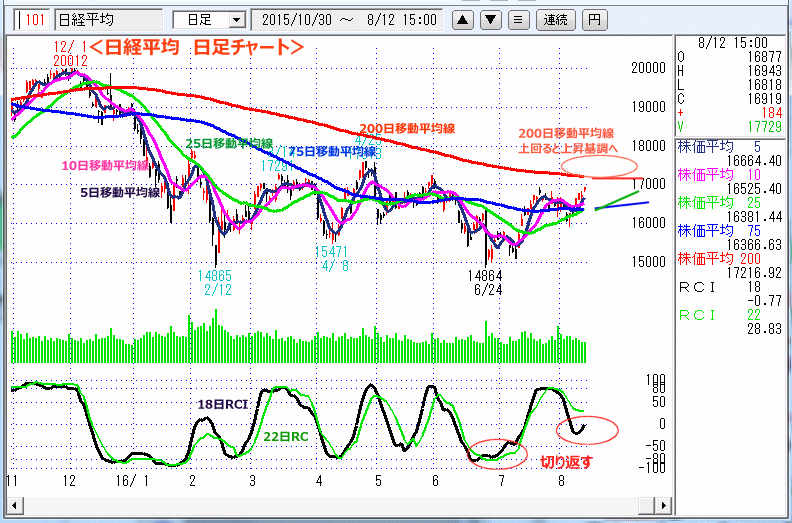 このまま底固めの動きが続けば、9月に入ると200日移動平均線を上回る上昇相場に転じそうです。8月相場は75日移動平均線をキープできるかどうかが、上昇基調に向かうかどうかの判断ポイントです。200日移動平均線を上回ると18000円前後まで上がる可能性はあります。再度75日移動平均線を下回るなら戻り売り相場に逆戻りします。8月相場どう動くか観察です。
