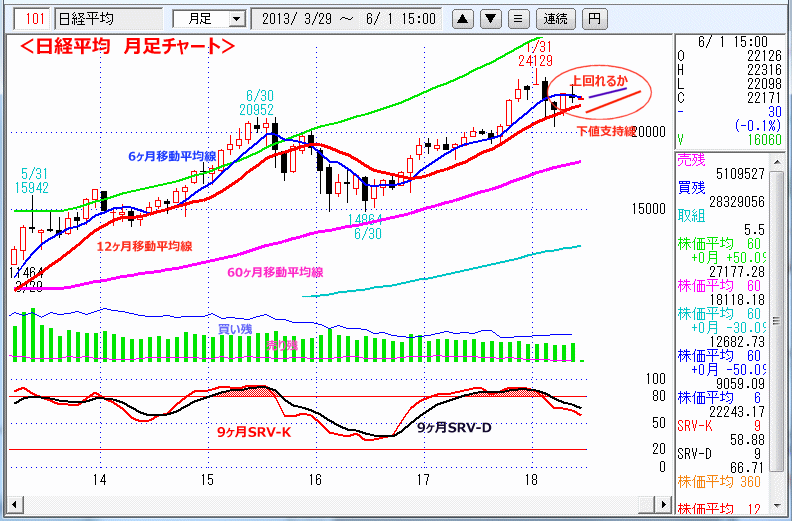 6月相場は上昇基調に戻せるか。調整相場は長引くか。日経平均は2万2500円以上で推移するなら、上昇相場に戻すと見ることはできます。2万2500円以下で推移するなら調整局面は続くと見なければなりません。6月は2万2500円→2万3000円、また6ヶ月移動平均線を上回れるか。基調判断の分かれ目のポイントです。