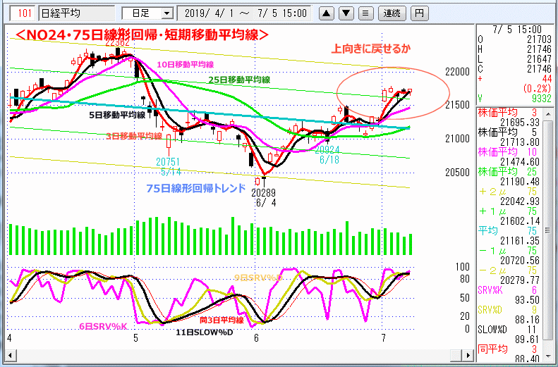 標準条件24番・75日線形回帰・短期移動平均線で見ています。75日線形回帰トレンド(中心線)下向き→やや緩やかになってきました。この状態から株価は+1μを上回って推移しています。この状態を維持できれば→横ばい→上向きにチェンジする事を意味します。