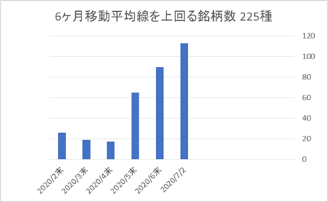 7月1週目の東証1部銘柄(2179銘柄)の6ヶ月移動平均線を上回る銘柄数は6月1週からは減ったが、6月末との比較は7月1週目は横ばいと言える。2020年1月末1187銘柄(225種115)→2月末267銘柄(225種26)→3月末230銘柄(225種19)→4月末415銘柄(225種17)→5月末1001銘柄(225種65)→6月末1104銘柄(225種90)→7月(2)1149銘柄(225種113)と横ばい状態です。2万3000円を付けてから利食い売りに押されている事が分かる。7月相場は切り返せるか。7月の観察ポイントです。