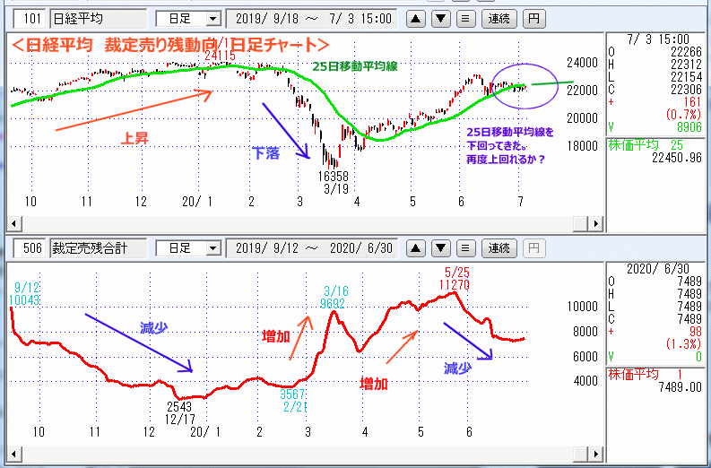 日経平均は25日移動平均線を下回っています。25日移動平均線を下回った動きから、調整から伸び悩む状態と判断できます。この様な状態から、裁定売り残の減少は止まってきたと言えます。25日移動平均線を上回れなければ、裁定売り残は増加に転ずる可能性もあります。今後の裁定売り残の増減動向が投資家心理と言えるでしょう。7月の観察ポイントです。