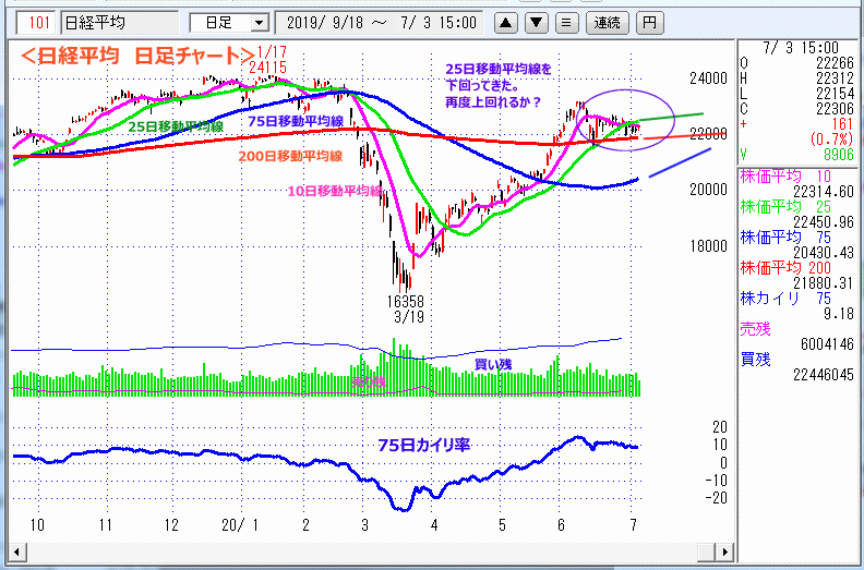 7月入りから、日経平均は10日移動平均線と25日移動平均線はDクロスしました。株価は25日移動平均線を下回っています。チャート的には10日移動平均線と25日移動平均線が上値抵抗線になった形ですが、200日移動平均線(下値支持線)を下回らなければシッカリしていると言えます。