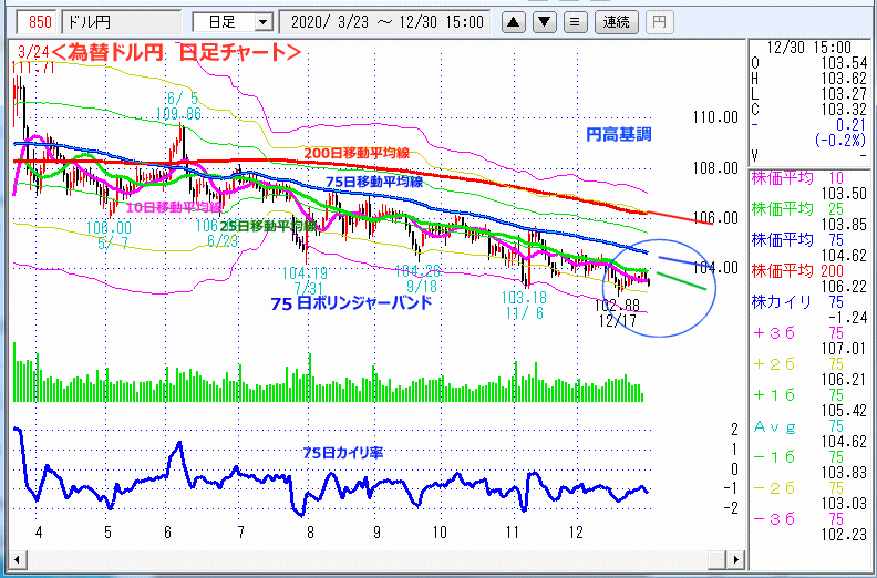 今年の「850」ドル円(為替)相場は円高基調で始まり、円高で終わる動きでした。75日ボリンジャーバンド中心線は下向き、25日移動平均線に沿った円高基調で今年を終えそうです。75日ボリンジャーバンド中心線は104円、-3シグマは102円まで円高は進みました。年明けも中心線から-3シグマ間で推移している円高への動きです。