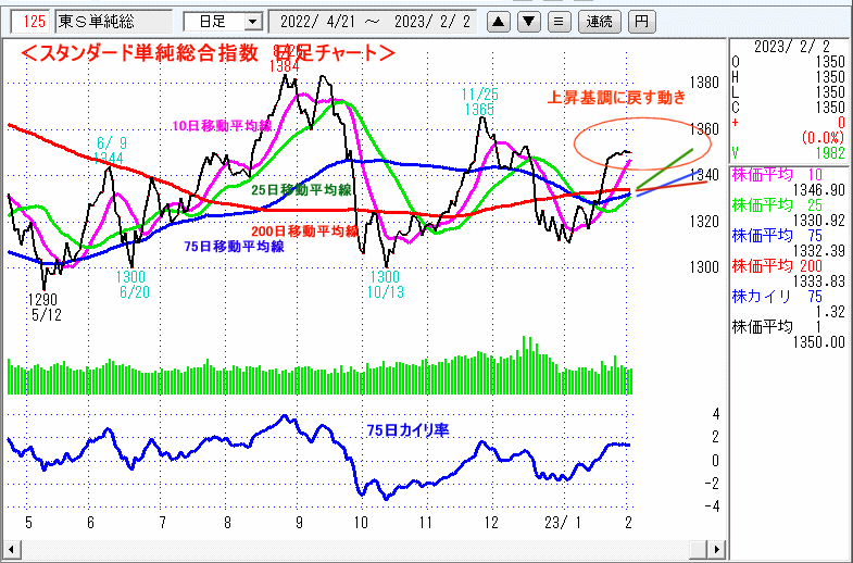 2月1週の東証スタンダード(1450銘柄)は半数を回復し、上昇転換した。75日移動平均線を上回る銘柄数は、2022年4月(4)705銘柄→4月末518銘柄→5月末657銘柄→6月末677銘柄→7月末859銘柄→8月末859→9月末435銘柄→10月末538銘柄→11月末777銘柄→12月末609銘柄→1月(6)625銘柄→1月(13)657銘柄→1月(20)758銘柄→1月(27)903銘柄→1月末905銘柄→2月(3)856銘柄と回復し増加は続いている。2月の観察ポイントです。