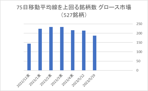5月3週のグロース市場(527銘柄)もGW明け(259)をピークに減少している。75日移動平均線を上回る銘柄数は、2022年4月(4)320銘柄→4月末192銘柄→10月末194銘柄→11月末251銘柄→12月(末)144銘柄→1月(23年)末254銘柄→2月末234銘柄→3月(末)255銘柄→4月(14)263銘柄→4月(21)232銘柄→4月(末)216銘柄→5月(12)214銘柄→5月(19)187銘柄と減少している。増加に戻せるか。5月の観察ポイントです。
