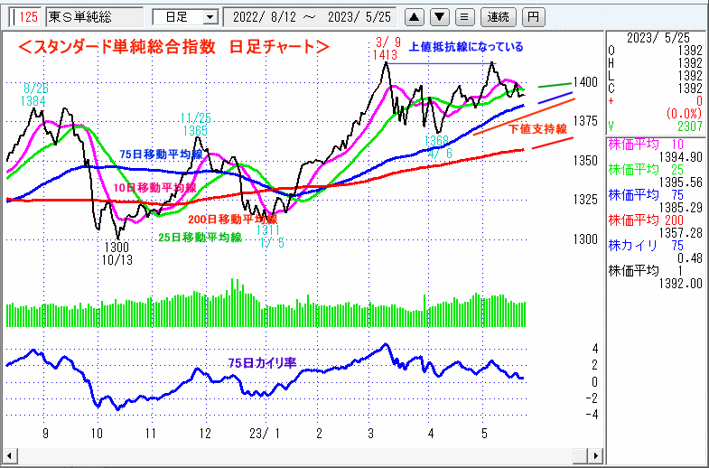 今年のスタンダード指数の動きは、上昇基調は維持していますが、25日移動平均線を下回ったり、上値ボックスの動きが続いています。3月高値を意識し、伸び悩んでいます。3月高値を上回れない間は、ボックス相場が続くと判断されます。6月に向けた観察ポイントです。