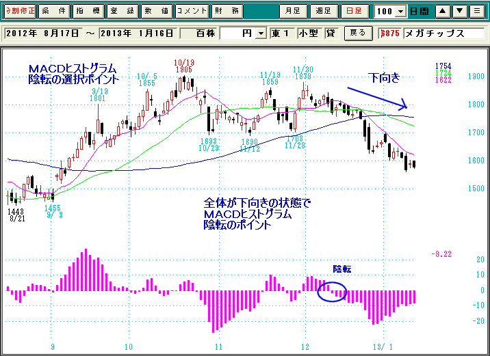 (2)MACDヒストグラムの陰転ポイント 全体が上向きの状態で(15日~30日移動平均線が下向き)MACDヒストグラムの陰転ポイントを「売り転換」のポイントとして絞り込む方が良いと思います。条件の組み合わせです。