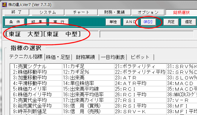 大型株と中型株の両方をグループ設定して銘柄選択する場合は、「OR」の機能を使います。ORの設定は2つのグループを設定して両方から銘柄を選択することが出来る機能です。