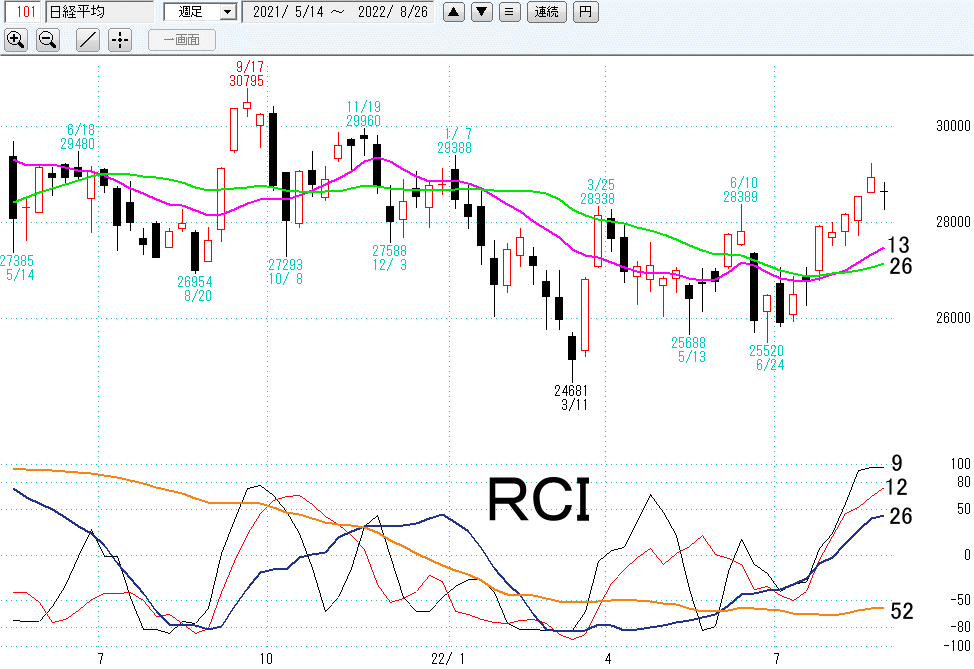 今回の戻りは、6/20の安値25520円からスタートし8/17の高値29222円まで上昇したが、中長期の週足RCIがボトム圏にあったという点が大きいと考えます。