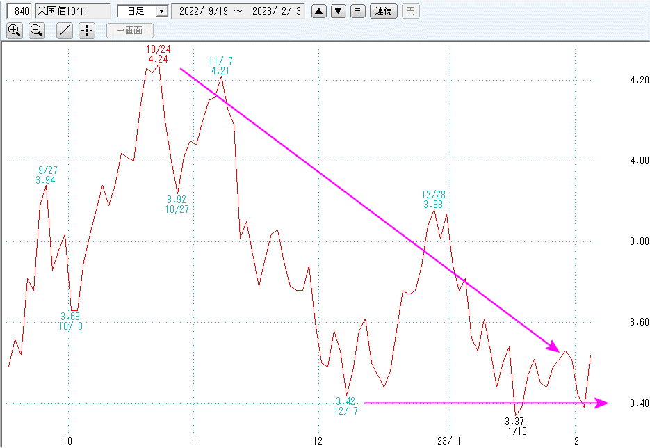 その米国10年債だが、昨年10月の4.2%台から3.5%割れまで低下が続いている。ただこのところ3.5%を割ると下げ渋り、大きな低下トレンドが一旦止まった感じにも見える。