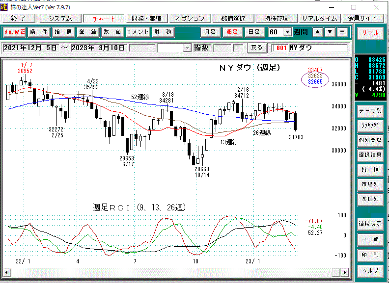 NYダウは6日に33572ドルまで戻していたが、デッドクロスする25日線と75日線に頭を叩かれ、そして9日に-543ドル、10日は31909-345ドルと4日続落して200日線を割り込んだ。そして週足は一度下支えになった26週線と52週線の重なる32600ドル台を割り込んでしまった。