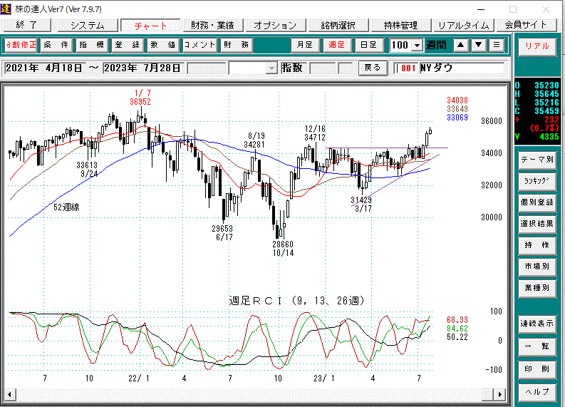 ただし、NYダウの日足チャートを見ると、RCI、RSI、サイコロなど短期テクニカル指標が100%を付けるなど高値圏信号を灯す。そしてケイ線は7/27高値35645ドルを中心に「つつみ足、はらみ足」を描き、10年債利回り(株達コード840)は27日に4%まで上昇している。